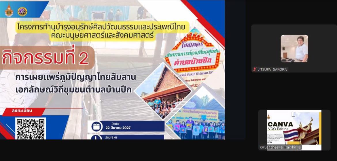 เมื่อวันที่ 22 มีนาคม 2568 ดร.จิตสุภา สาคร รองคณบดีฝ่ายกิจการนักศึกษาและกิจการพิเศษ กล่าวเปิดโครงการทำนุบำรุงอนุรักษ์ศิลปวัฒนธรรมและประเพณีไทย คณะมนุษยศาสตร์และสังคมศาสตร์ กิจกรรมที่ 2 การเผยแพร่ภูมิปัญญาไทยสืบสานเอกลักษณ์วิถีชุมชนตำบลบ้านปึก เพื่อเป็นการเผยแพร่ การเผยแพร่ภูมิปัญญาไทยสืบสานเอกลักษณ์วิถีชุมชนตำบลบ้านปึก และการแข่งขันการประกวดโปสเตอร์กราฟฟิก “เส้นทางการท่องเที่ยวชุมชนตำบลบ้านปึก จังหวัดชลบุรี “